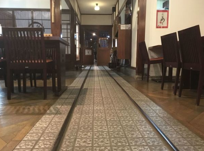 トロッコが走っていた過去のレールもそのままに店内にそのままに残している斬新な空間。